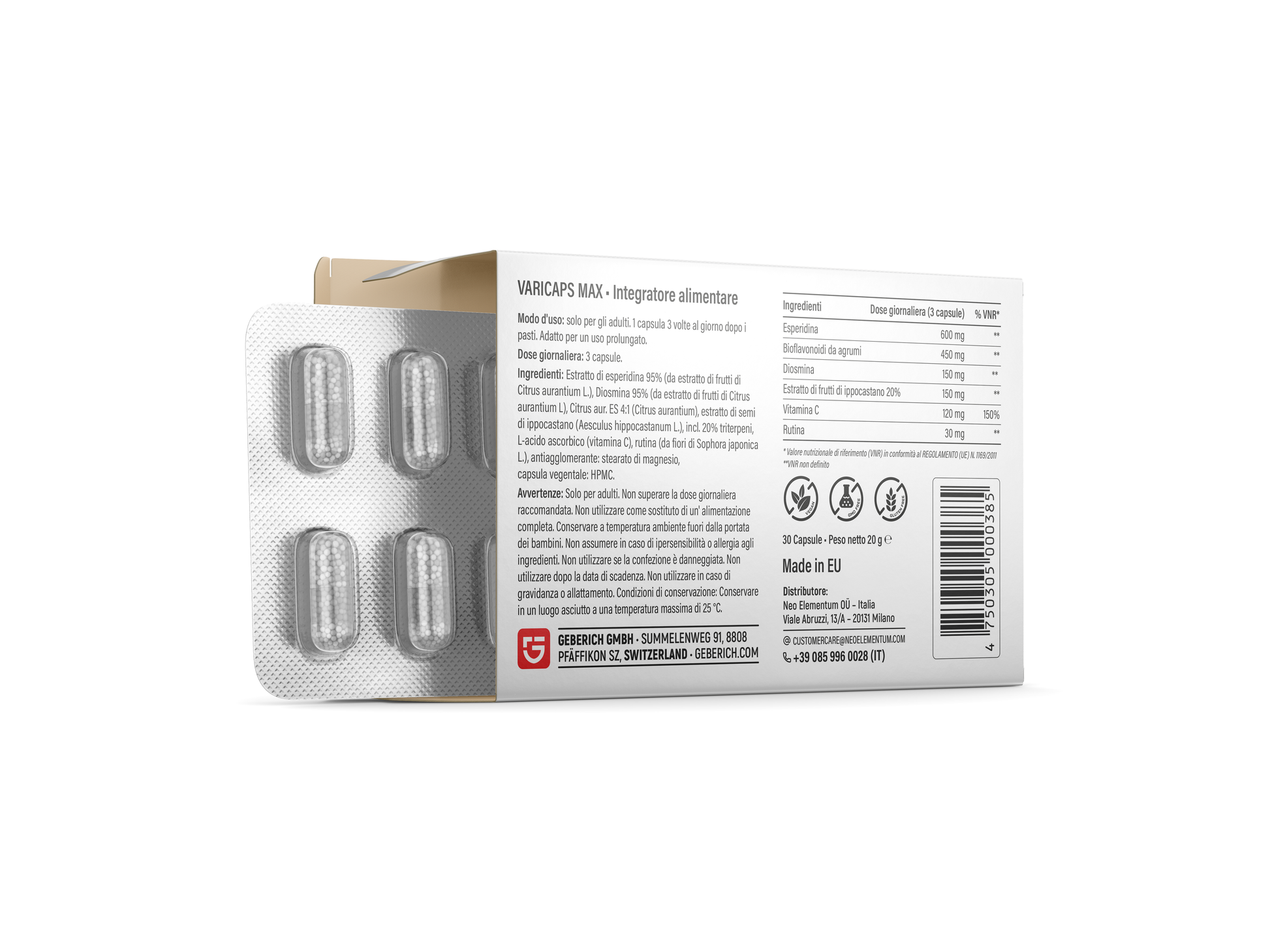VARICAPS MAX caps Natural supplement with Diosmin, Hesperidin, Horse Chestnut, and Vitamin C to support healthy blood circulation and vascular tone. Helps reduce the feeling of heavy legs and maintain strong capillaries.